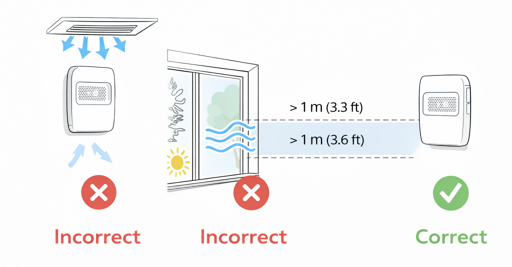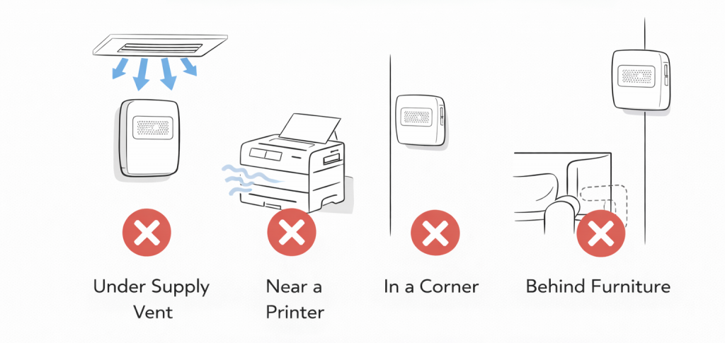 Many monitoring issues stem from predictable errors. Mounting a device directly under a vent, near a printer, beside a cleaning supply cabinet, or in a stagnant corner can produce skewed readings. Positioning the unit too high, too low, or behind furniture limits airflow around the sensors.