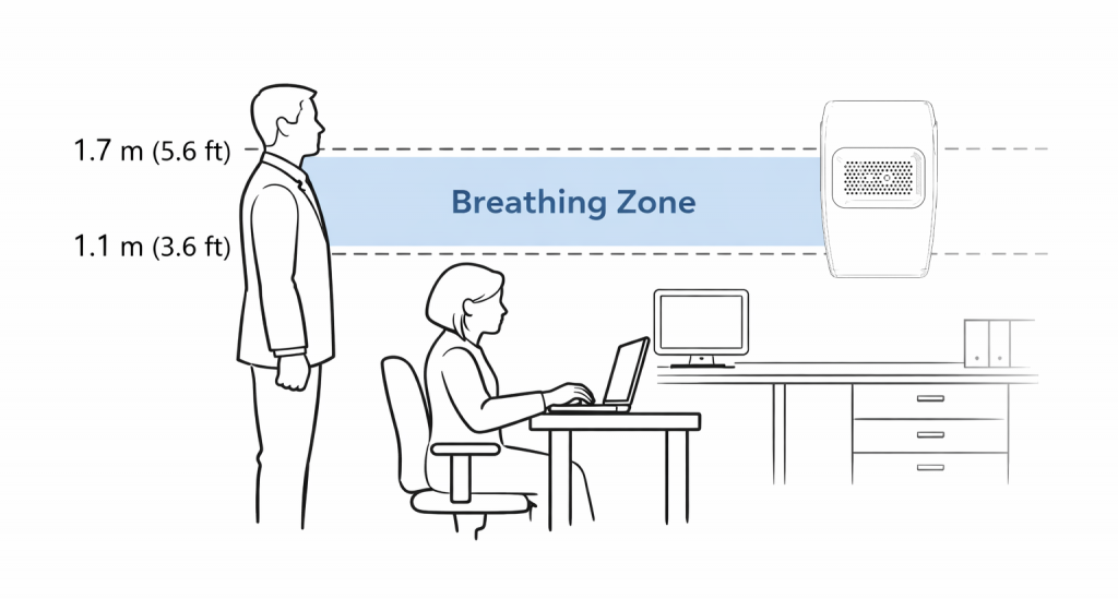 The most important concept in commercial IAQ monitor placement is the breathing zone. This refers to the vertical range where occupants inhale air during normal activity. According to commonly referenced guidelines such as ASHRAE and WELL, this zone sits approximately 1.1 to 1.7 meters (3.6 to 5.6 feet) above the floor.