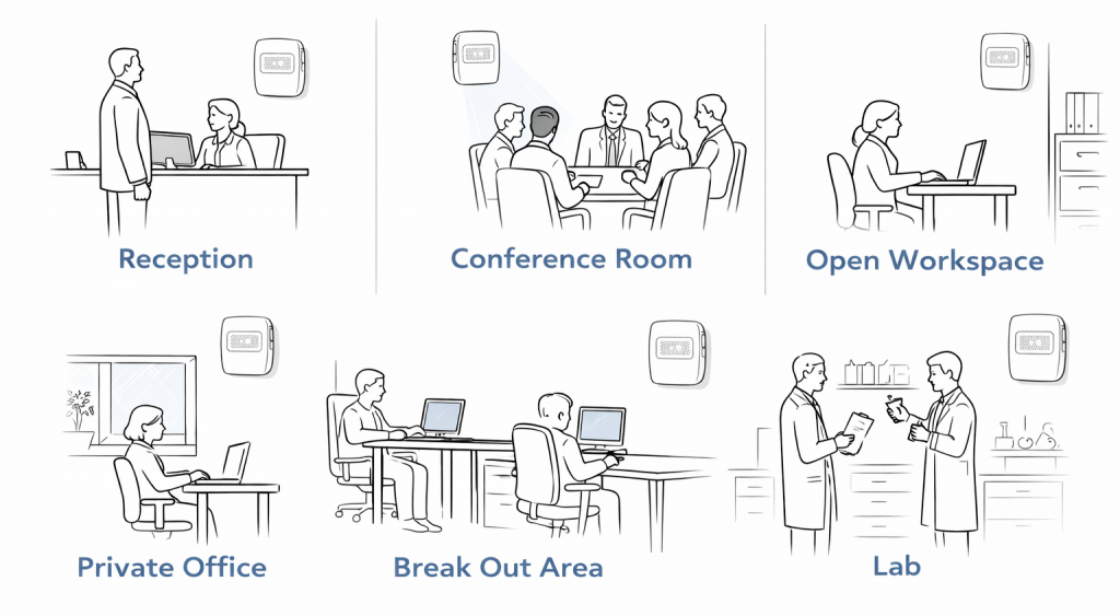 The most valuable air quality data comes from spaces that are regularly occupied. Reception areas, open workstations, conference rooms, private offices, and collaborative zones are typically the most critical monitoring points in commercial environments.